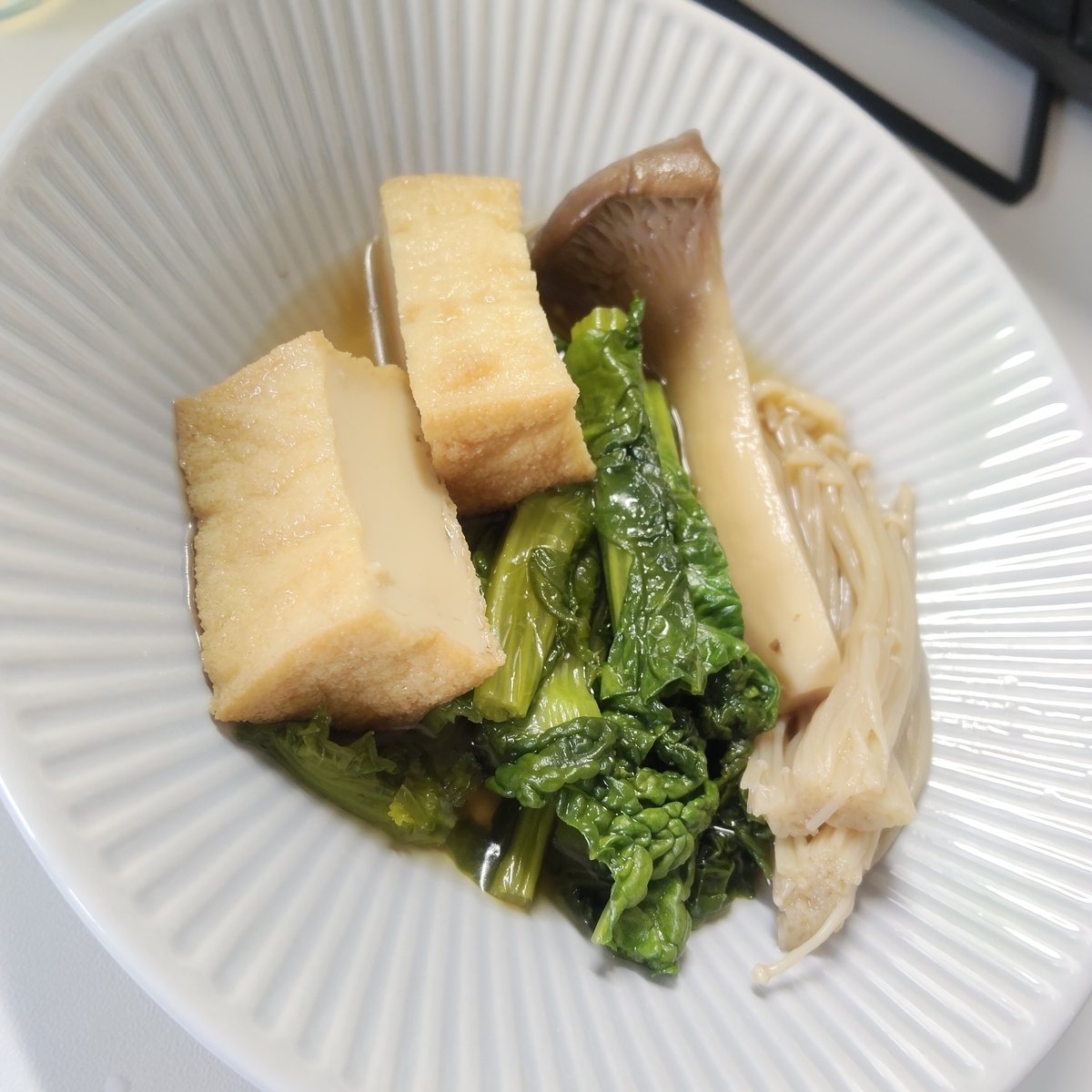 厚揚げと一緒に炊いてやれば美味しいお出汁が出るから、ほんの少し砂糖・みりんを多めに入れたら優しい甘さになる。ついでに入れたエリンギ・エノキもイイ感じ。